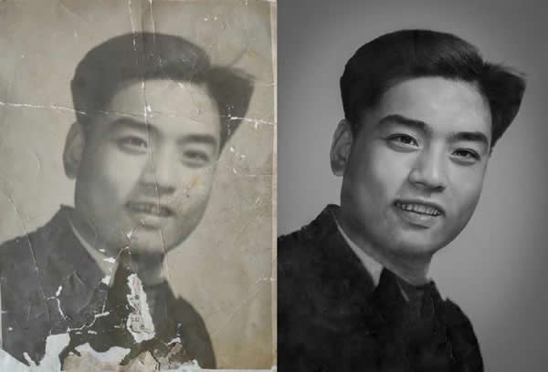 其中修复画笔工具和仿制图章工具的不同之处是:仿制图章工具是将定义点全部照搬,而修复画笔工具会加入目标点的纹理,阴影,光等因素。所以说在背景颜色、光线相接近时可用仿制图章工具。如果有差别可以用修复画笔。比如皮肤。用修复画笔可以很好地保持皮肤的纹理。下面是用部分工具做的一张老照片翻新粗略效果: